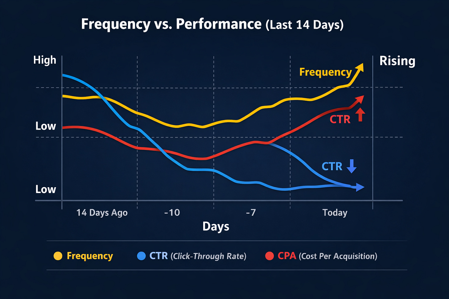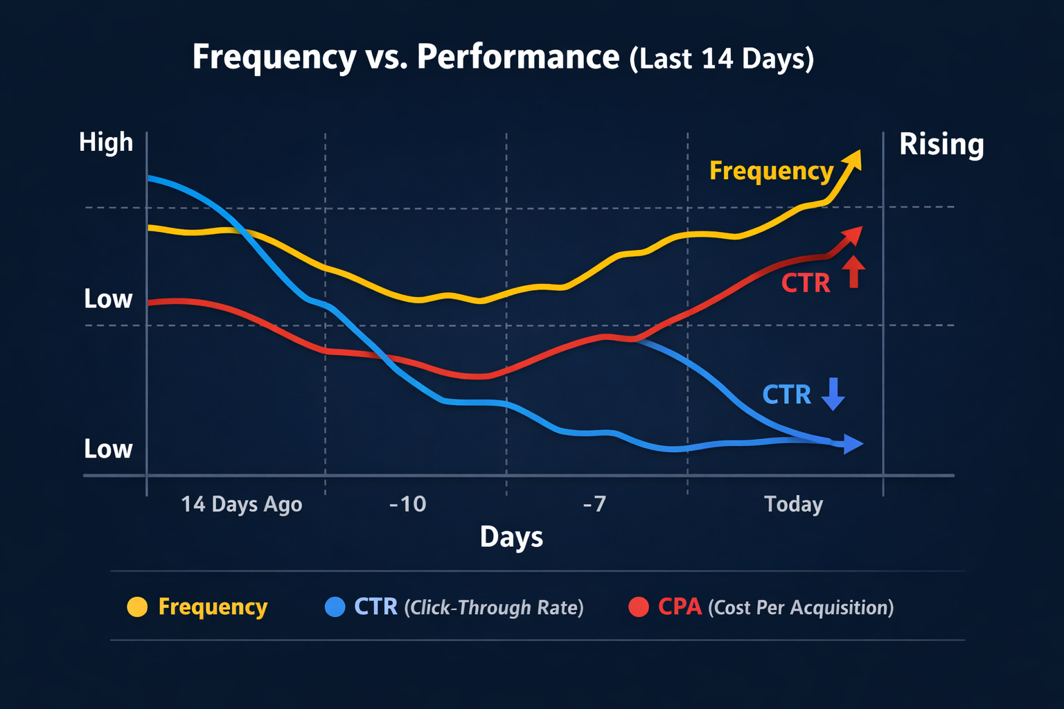 What “bad” looks like: frequency creeping up but unique reach flat, or delivery swinging wildly day-to-day (pacing instability).