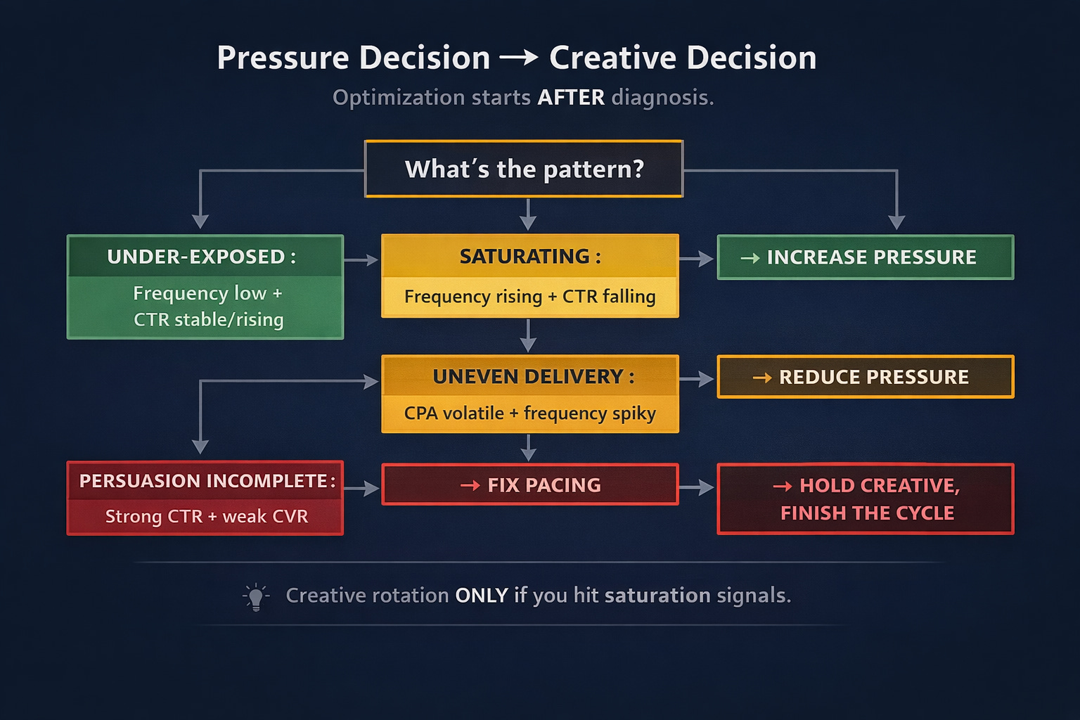 Under-exposed: Frequency low + CTR stable/rising → increase pressure